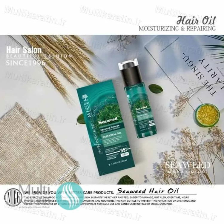 روغن مو جلبک دریایی میگه Seaweed Mige ویژگی ها تغذیه کننده مو کنترل کننده شوره سر ترمیم کننده مو ضد ریزش مرطوب کننده رفع شکنندگی و نازک شدن مو استحکام بخشی به موها مراقبت از پالپ مو فاقد سولفات ساخت ایتالیا سایز ۱۰۰ میل مناسب برای موهای کراتین شده روغن جلبک میگ حاوی روغن آرگان، پرو ویتامین B5 ، اسید آمینه های مورد نیاز مو و همچنین کراتین و کلاژن میباشد. این محصول فوق العاده از برند میگ با آبرسانی و تغذیه مو سبب نرمی و براقیت موها می گردد و صافی موها را نیز بهبود میبخشد. روغن میگ شامل هیچ ماده شیمیایی نیست و با ترکیبات کاملا طبیعی بوی بسیار مطبوعی دارد.