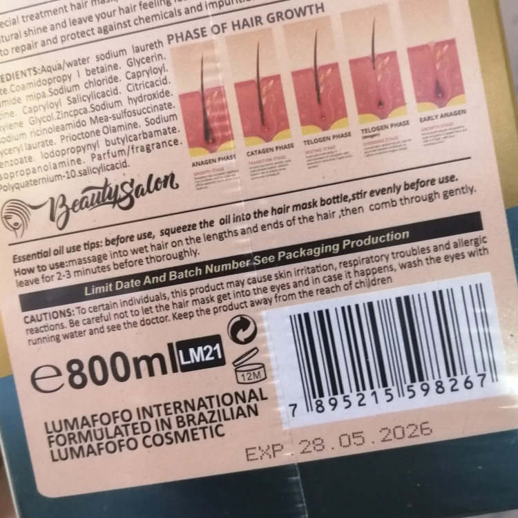 ماسک لوما فوفو حاوی پروتئین 800میل LUMA FOFO the Hair Mask Protein Brazilian ماسک لوما فوفو حاوی پروتئین 800میل جهت مرطوب کننده و آبرسانی به ریشه مو مورد استفاده قرار میگیرد. همچنین از خشکی و کدر شدن ان جلوگیری نموده، به سرعت به ریشه مو نفوذ کرده و باعث ترمیم موهای آسیب دیده می گردد. تارهای خشک و سفت را تغذیه و ساختار ان را نرم می کند. این محصول فاقد سولفات ، پارابن بوده و به همین دلیل مناسب استفاده انواع تراپی ، موهای رنگ شده و آسیب دیده می باشد. ویژگیهای ماسک لوما فوفو حاوی پروتئین 800میل برند لومافوفو luma fofo ساخت کشور برزیل ماسک لوما فوفو حاوی پروتئین مناسب انواع موها و موهای کراتین شده ، رنگ شده و آسیب دیده حاوی پروتئین حاوی کراتین و کلاژن تقویت کننده و حجیم ساز ترمیم موهای آسیب دیده حالت دهنده جلوگیری از خشکی و کدر شدن مو مرطوب کننده و آبرسان درخشان کننده و نرم کننده جلوگیری از ریزش، شکنندگی و دوشاخه شدن تارها 800 میل